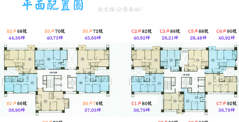 三房規劃34坪~44坪,(C2戶C6戶B2戶B6戶)都面相公園,